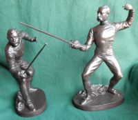 10. Late 19th c. spelter foilists by Bénédict Rougelet, Le bon et le mauvais escrimeur, 28 cm and 24 cm high
